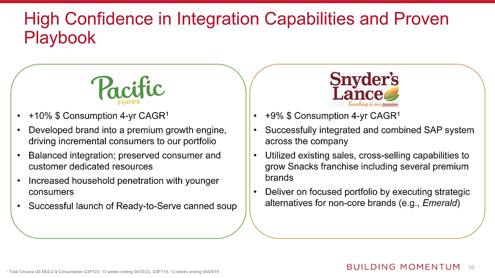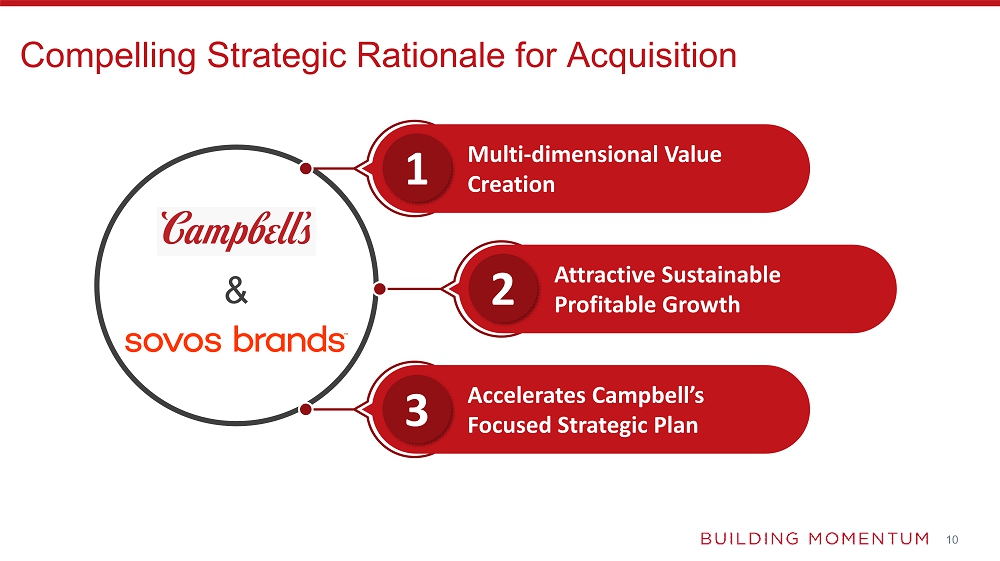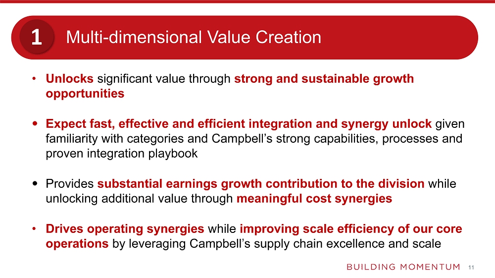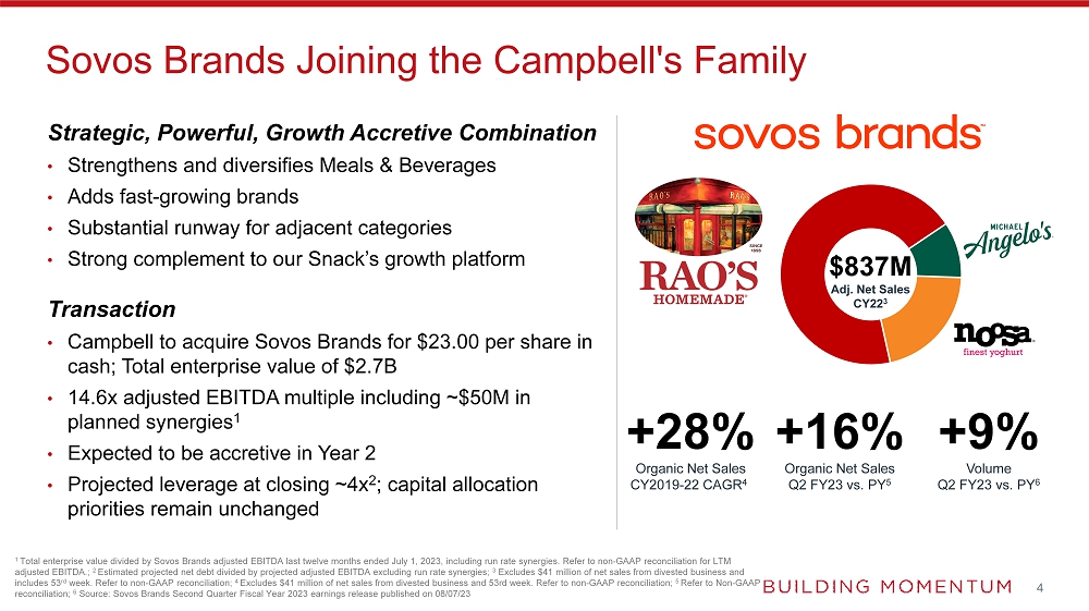 The all-cash offer for Sovos Brands of $23 per share for a total enterprise value of approximately $2.7 billion represents an adjusted EBITDA multiple of 14.6x including run rate synergies and 19.8x excluding synergies6. The acquisition is expected to support Campbell’s long-term financial growth algorithm with expected annualized cost synergies reaching approximately $50 million over the next two years, applying the learnings from the successful integrations of Snyder’s-Lance and Pacific Foods. The transaction is expected to be accretive to adjusted diluted earnings per share by the second year, excluding one-time integration expenses and costs to achieve synergies.