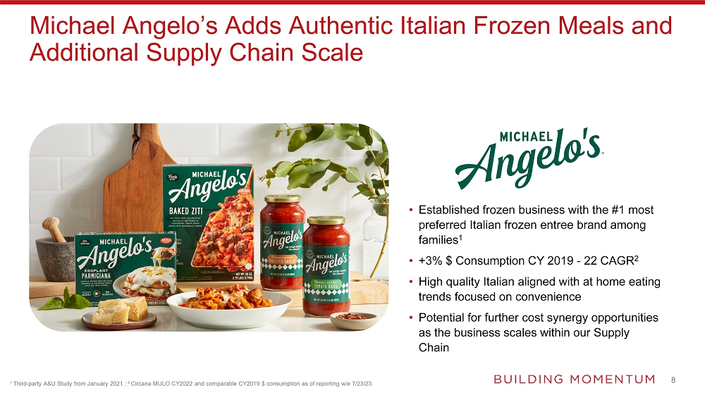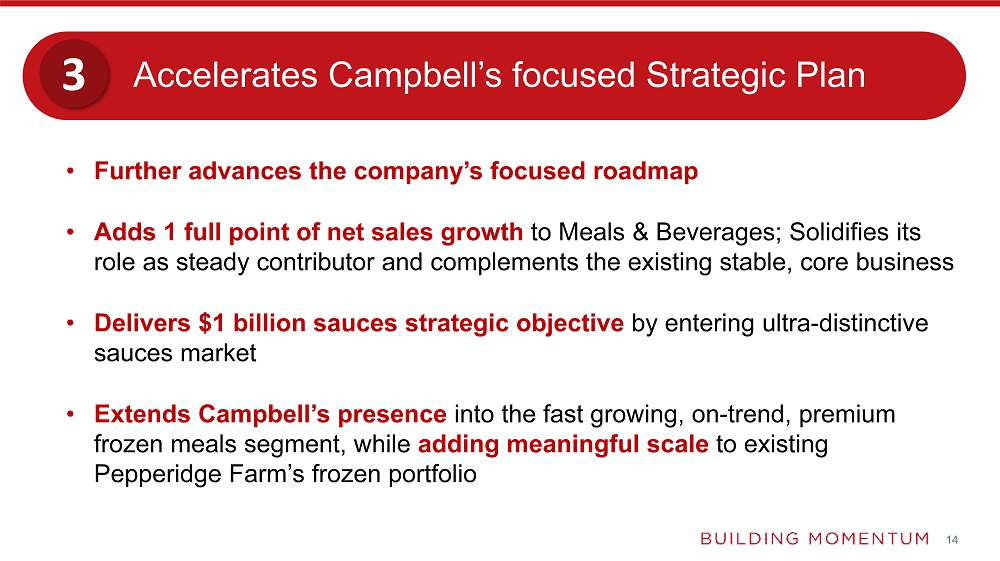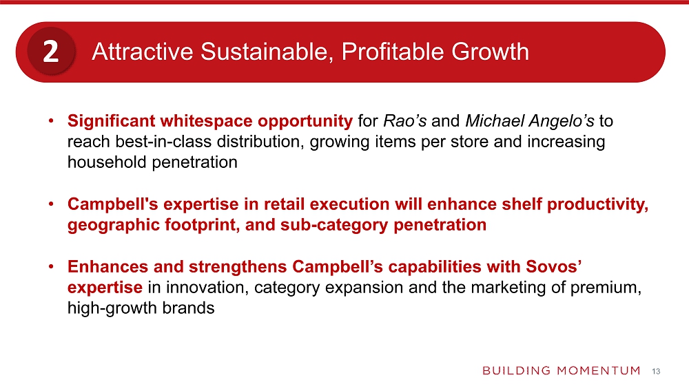 | o | Extends Campbell’s presence into the fast growing, on-trend, premium frozen meals segment with Rao’s and Michael Angelo’s, while adding meaningful scale to the existing Pepperidge Farm’s frozen portfolio |