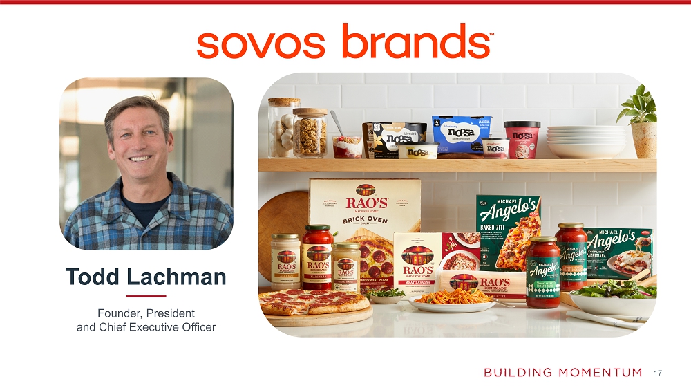 Sovos Brands, Inc. is a consumer-packaged food company focused on acquiring and building disruptive growth brands that bring today’s consumers great tasting food that fits the way they live. The company’s product offerings include a variety of pasta sauces, dry pasta, soups, frozen entrées, frozen pizza and yogurts, all of which are sold in North America under the brand names Rao’s, Michael Angelo’s and noosa. All Sovos Brands’ products are built with
