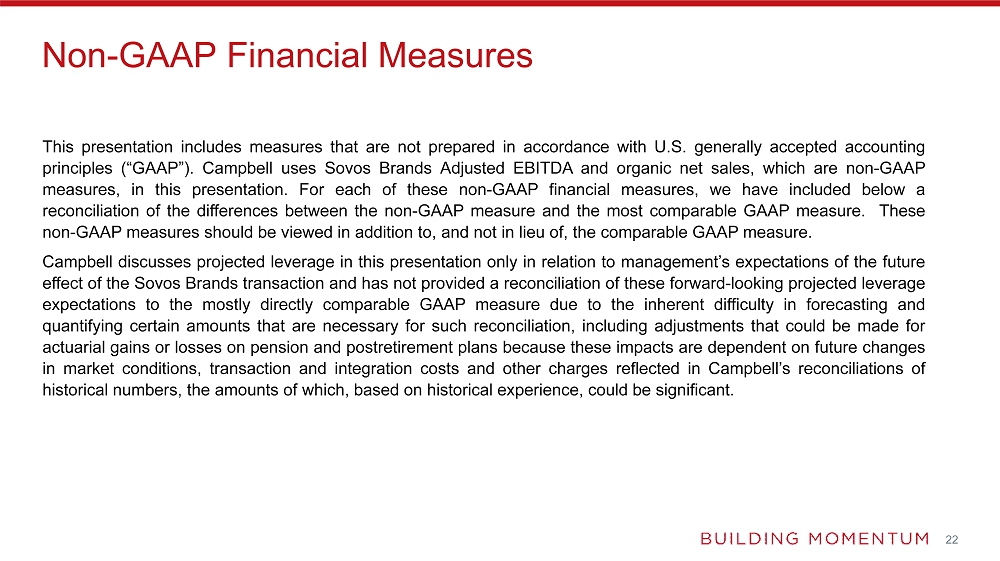 Campbell discusses projected leverage in this press release only in relation to management’s expectations of the future effect of the Sovos Brands transaction and has not provided a reconciliation of these forward-looking projected leverage expectations to the mostly directly comparable GAAP measure due to the inherent difficulty in forecasting and quantifying certain amounts that are necessary for such reconciliation, including adjustments that could be made for actuarial gains or losses on pension and postretirement plans because these impacts are dependent on future changes in market conditions, transaction and integration costs and other charges reflected in Campbell’s reconciliations of historical numbers, the amounts of which, based on historical experience, could be significant.