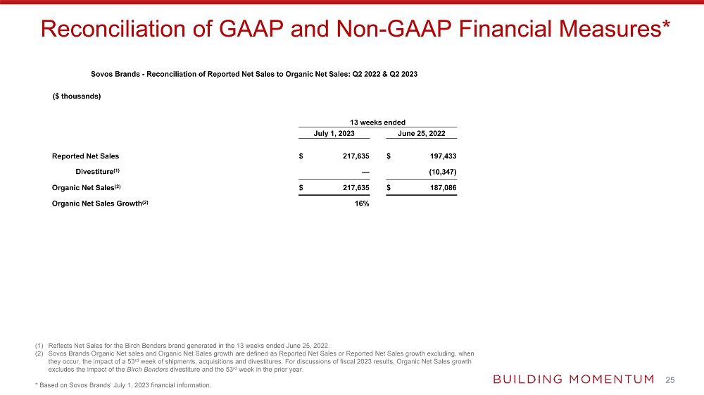 | (3) | Sovos Brands Organic Net Sales and Organic Net Sales growth are defined as Reported Net Sales or Reported Net Sales growth excluding, when they occur, the impact of a 53rd week of shipments, acquisitions, and divestitures. |