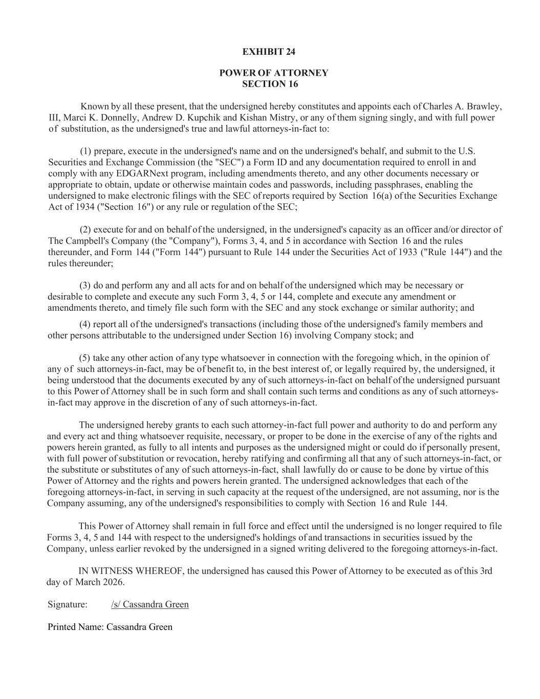 EXHIBIT 24 POWER OF ATTORNEY SECTION 16 Known by all these present, that the undersigned hereby constitutes and appoints each of Charles A. Brawley, III, Marci K. Donnelly, Andrew D. Kupchik and Kishan Mistry, or any of them signing singly, and with full power of substitution, as the undersigned's true and lawful attorneys-in-fact to: (1) prepare, execute in the undersigned's name and on the undersigned's behalf, and submit to the U.S. Securities and Exchange Commission (the "SEC") a Form ID and any documentation required to enroll in and comply with any EDGARNext program, including amendments thereto, and any other documents necessary or appropriate to obtain, update or otherwise maintain codes and passwords, including passphrases, enabling the undersigned to make electronic filings with the SEC of reports required by Section 16(a) of the Securities Exchange Act of 1934 ("Section 16") or any rule or regulation of the SEC; (2) execute for and on behalf of the undersigned, in the undersigned's capacity as an officer and/or director of The Campbell's Company (the "Company"), Forms 3, 4, and 5 in accordance with Section 16 and the rules thereunder, and Form 144 ("Form 144") pursuant to Rule 144 under the Securities Act of 1933 ("Rule 144") and the rules thereunder; (3) do and perform any and all acts for and on behalf of the undersigned which may be necessary or desirable to complete and execute any such Form 3, 4, 5 or 144, complete and execute any amendment or amendments thereto, and timely file such form with the SEC and any stock exchange or similar authority; and (4) report all of the undersigned's transactions (including those of the undersigned's family members and other persons attributable to the undersigned under Section 16) involving Company stock; and (5) take any other action of any type whatsoever in connection with the foregoing which, in the opinion of any of such attorneys-in-fact, may be of benefit to, in the best interest of, or legally required by, the undersigned, it being understood that the documents executed by any of such attorneys-in-fact on behalf of the undersigned pursuant to this Power of Attorney shall be in such form and shall contain such terms and conditions as any of such attorneys- in-fact may approve in the discretion of any of such attorneys-in-fact. The undersigned hereby grants to each such attorney-in-fact full power and authority to do and perform any and every act and thing whatsoever requisite, necessary, or proper to be done in the exercise of any of the rights and powers herein granted, as fully to all intents and purposes as the undersigned might or could do if personally present, with full power of substitution or revocation, hereby ratifying and confirming all that any of such attorneys-in-fact, or the substitute or substitutes of any of such attorneys-in-fact, shall lawfully do or cause to be done by virtue of this Power of Attorney and the rights and powers herein granted. The undersigned acknowledges that each of the foregoing attorneys-in-fact, in serving in such capacity at the request of the undersigned, are not assuming, nor is the Company assuming, any of the undersigned's responsibilities to comply with Section 16 and Rule 144. This Power of Attorney shall remain in full force and effect until the undersigned is no longer required to file Forms 3, 4, 5 and 144 with respect to the undersigned's holdings of and transactions in securities issued by the Company, unless earlier revoked by the undersigned in a signed writing delivered to the foregoing attorneys-in-fact. IN WITNESS WHEREOF, the undersigned has caused this Power of Attorney to be executed as of this 3rd day of March 2026. Signature: /s/ Cassandra Green Printed Name: Cassandra Green