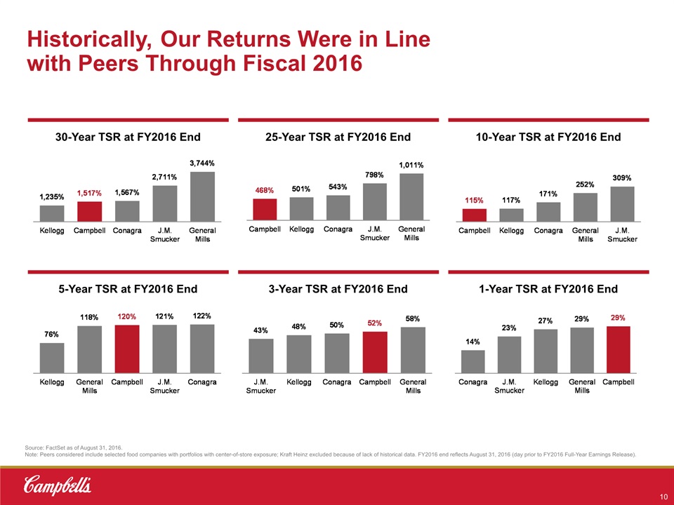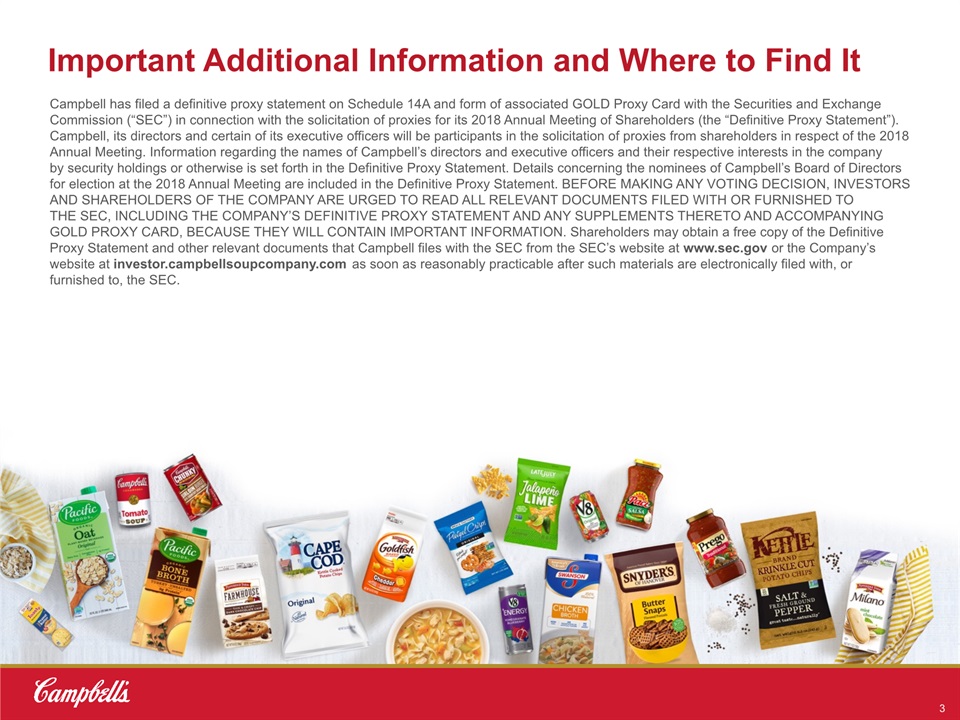 Important Additional Information and Where to Find It Campbell has filed a definitive proxy statement on Schedule 14A and form of associated GOLD Proxy Card with the Securities and Exchange Commission (“SEC”) in connection with the solicitation of proxies for its 2018 Annual Meeting of Shareholders (the “Definitive Proxy Statement”). Campbell, its directors and certain of its executive officers will be participants in the solicitation of proxies from shareholders in respect of the 2018 Annual Meeting. Information regarding the names of Campbell’s directors and executive officers and their respective interests in the company by security holdings or otherwise is set forth in the Definitive Proxy Statement. Details concerning the nominees of Campbell’s Board of Directors for election at the 2018 Annual Meeting are included in the Definitive Proxy Statement. BEFORE MAKING ANY VOTING DECISION, INVESTORS AND SHAREHOLDERS OF THE COMPANY ARE URGED TO READ ALL RELEVANT DOCUMENTS FILED WITH OR FURNISHED TO THE SEC, INCLUDING THE COMPANY’S DEFINITIVE PROXY STATEMENT AND ANY SUPPLEMENTS THERETO AND ACCOMPANYING GOLD PROXY CARD, BECAUSE THEY WILL CONTAIN IMPORTANT INFORMATION. Shareholders may obtain a free copy of the Definitive Proxy Statement and other relevant documents that Campbell files with the SEC from the SEC’s website at www.sec.gov or the Company’s website at investor.campbellsoupcompany.com as soon as reasonably practicable after such materials are electronically filed with, or furnished to, the SEC. 3