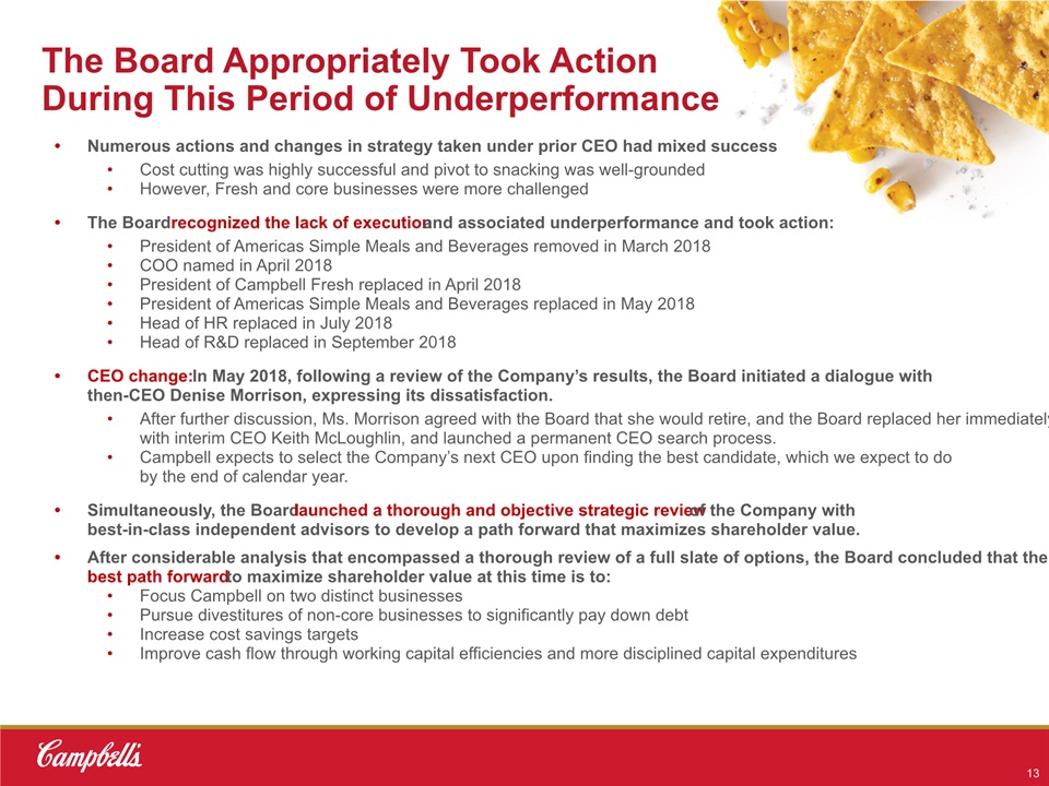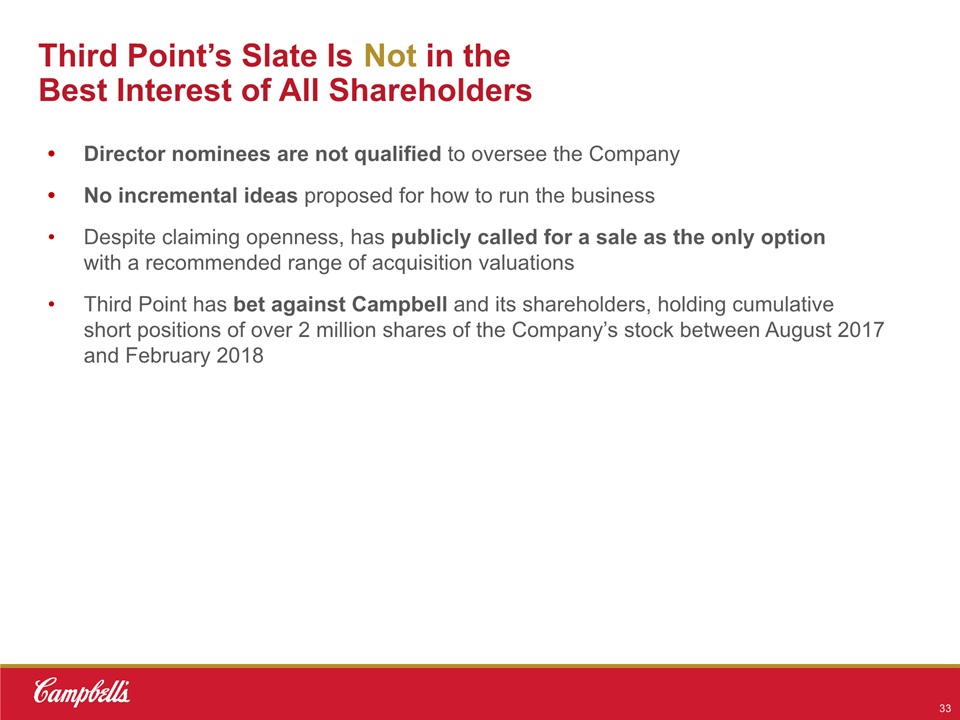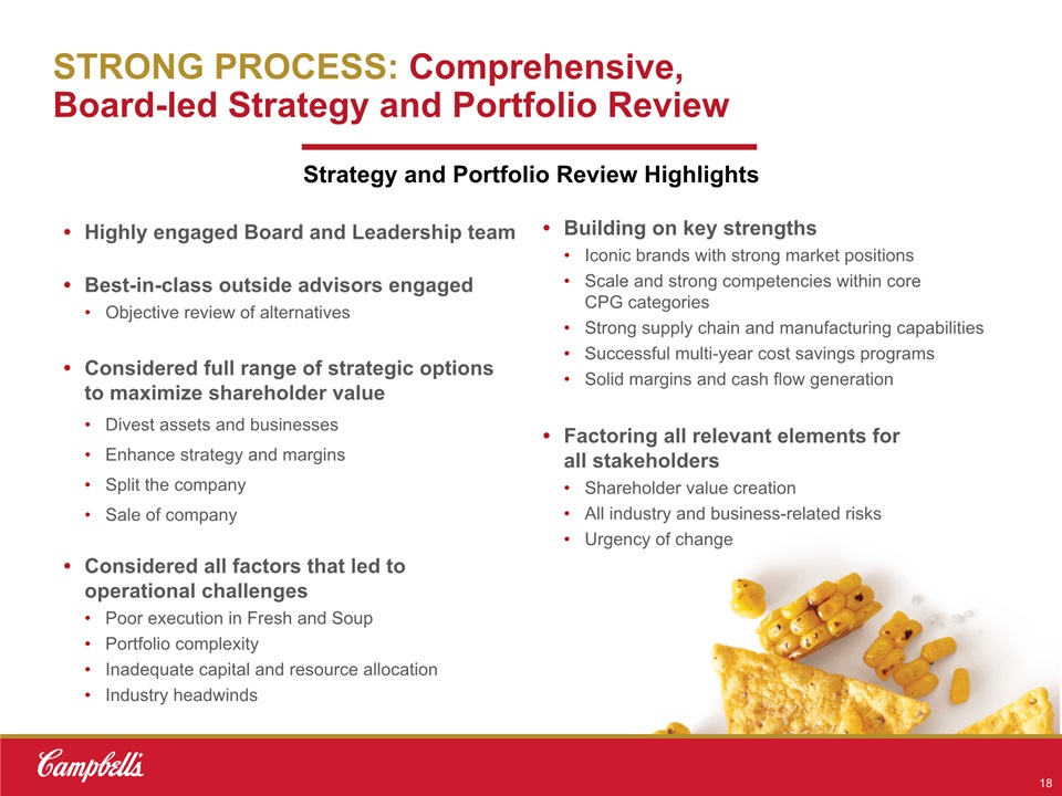 2016 2018 2017 May 23Roberto Leopardi named President, Meals & Beverages Dec 18Campbell announces acquisition of Snyder's-Lance Mar 21 Tessa Hilado added to the Board Apr 5Campbell names Luca Mignini COO and Ana Dominguez President of C-Fresh Jul 11Diego Palmieri named CMO and VP, Meals & Beverages Sep 7Third Point nominates a full slate of 12 candidates to replace current Board members Aug 22Mr. Loeb sends a letter to the Chairman of the Board expressing his view that the Company should be sold Aug 30Campbell announces renewed strategy which includes the sale of its International and Fresh units Nov 15 Howard Averill added to the Board Jun 29Third Point provides a letter to the Board stating its intention to acquire voting stock Aug 9Third Point files 13D urging Campbell to explore a sale May 18Denise Morrison departs; Keith McLoughlin named interim CEO Jul 6 Campbell announces acquisition of Pacific Foods Mar 2017Fabiola Arredondo added to the Board May 18Campbell announces CEO Transition Plan & Strategic Review The Campbell Board Has Been Driving Change Long Before Third Point Bought ONE Share of Stock 17 Board Fully Knowledgeable of Performance and Challenges and Took Action Strategic Review Launched with Highly Qualified Interim CEO and All Options On The Table KEY: Board Changes Management ChangesStrategic Acquisitions Strategic Updates Third Point Actions Aug 2017 - Feb 2018Third Point held short position in Campbell of over 2 million shares Mar 19President of Americas Simple M&B removed July 18Xavier Boza named Head of HR September 10Craig Slavtcheff named Head of R&D Feb 2016 Keith McLoughlin added to the Board
