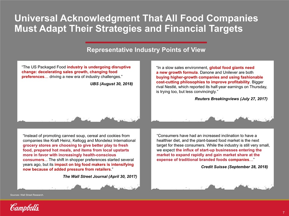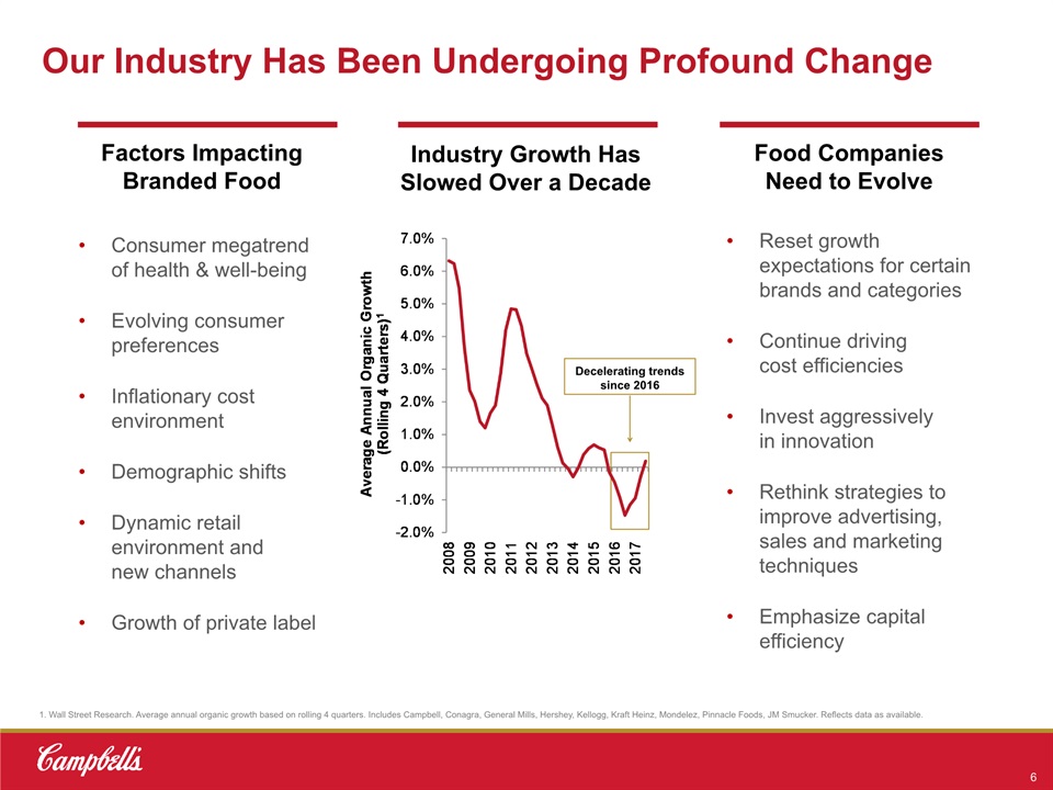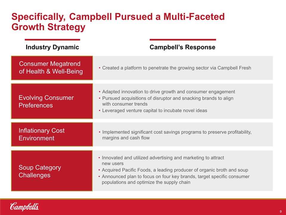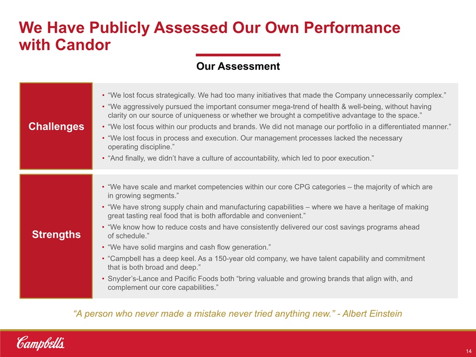 We Have Publicly Assessed Our Own Performance with Candor “A person who never made a mistake never tried anything new.” - Albert Einstein 14 Challenges Strengths “We lost focus strategically. We had too many initiatives that made the Company unnecessarily complex.”“We aggressively pursued the important consumer mega-trend of health & well-being, without having clarity on our source of uniqueness or whether we brought a competitive advantage to the space.”“We lost focus within our products and brands. We did not manage our portfolio in a differentiated manner.” “We lost focus in process and execution. Our management processes lacked the necessary operating discipline.”“And finally, we didn’t have a culture of accountability, which led to poor execution.” “We have scale and market competencies within our core CPG categories – the majority of which are in growing segments.”“We have strong supply chain and manufacturing capabilities – where we have a heritage of making great tasting real food that is both affordable and convenient.”“We know how to reduce costs and have consistently delivered our cost savings programs ahead of schedule.” “We have solid margins and cash flow generation.”“Campbell has a deep keel. As a 150-year old company, we have talent capability and commitment that is both broad and deep.”Snyder’s-Lance and Pacific Foods both “bring valuable and growing brands that align with, and complement our core capabilities.” Our Assessment