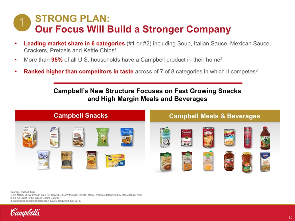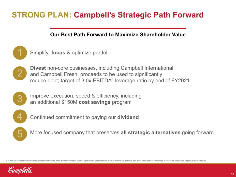 Simplify, focus & optimize portfolio Divest non-core businesses, including Campbell International and Campbell Fresh; proceeds to be used to significantly reduce debt; target of 3.0x EBITDA1 leverage ratio by end of FY2021 Improve execution, speed & efficiency, including an additional $150M cost savings program Continued commitment to paying our dividend More focused company that preserves all strategic alternatives going forward STRONG PLAN: Campbell’s Strategic Path Forward 19 1 Our Best Path Forward to Maximize Shareholder Value 2 3 4 5 1. A non-GAAP reconciliation is not provided since certain items are not estimable, such as pension and postretirement mark-to-market adjustments, and these items are not considered to reflect the company’s ongoing business results.