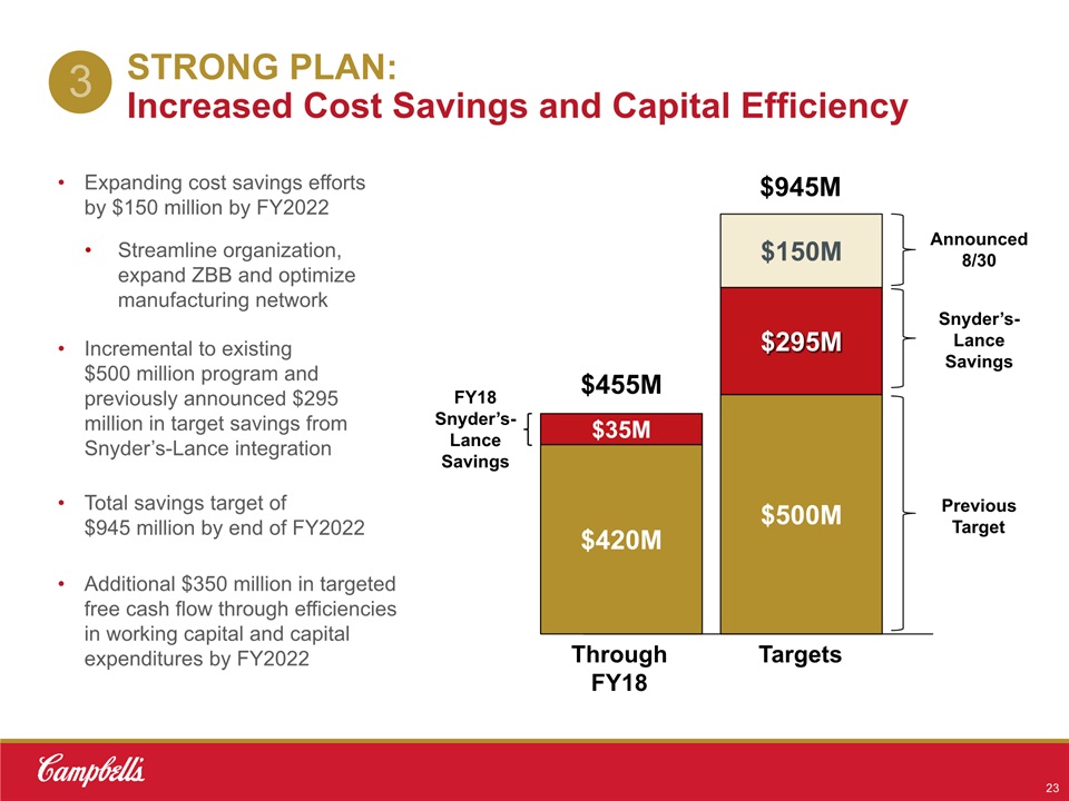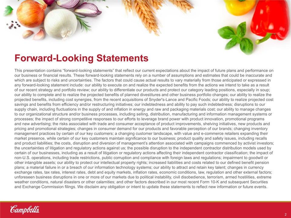 Forward-Looking Statements This presentation contains “forward-looking statements” that reflect our current expectations about the impact of future plans and performance on our business or financial results. These forward-looking statements rely on a number of assumptions and estimates that could be inaccurate and which are subject to risks and uncertainties. The factors that could cause actual results to vary materially from those anticipated or expressed in any forward-looking statement include: our ability to execute on and realize the expected benefits from the actions we intend to take as a result of our recent strategy and portfolio review; our ability to differentiate our products and protect our category leading positions, especially in soup; our ability to complete and to realize the projected benefits of planned divestitures and other business portfolio changes; our ability to realize the projected benefits, including cost synergies, from the recent acquisitions of Snyder's-Lance and Pacific Foods; our ability to realize projected cost savings and benefits from efficiency and/or restructuring initiatives; our indebtedness and ability to pay such indebtedness; disruptions to our supply chain, including fluctuations in the supply of and inflation in energy and raw and packaging materials cost; our ability to manage changes to our organizational structure and/or business processes, including selling, distribution, manufacturing and information management systems or processes; the impact of strong competitive responses to our efforts to leverage brand power with product innovation, promotional programs and new advertising; the risks associated with trade and consumer acceptance of product improvements, shelving initiatives, new products and pricing and promotional strategies; changes in consumer demand for our products and favorable perception of our brands; changing inventory management practices by certain of our key customers; a changing customer landscape, with value and e-commerce retailers expanding their market presence, while certain of our key customers maintain significance to our business; product quality and safety issues, including recalls and product liabilities; the costs, disruption and diversion of management’s attention associated with campaigns commenced by activist investors; the uncertainties of litigation and regulatory actions against us; the possible disruption to the independent contractor distribution models used by certain of our businesses, including as a result of litigation or regulatory actions affecting their independent contractor classification; the impact of non-U.S. operations, including trade restrictions, public corruption and compliance with foreign laws and regulations; impairment to goodwill or other intangible assets; our ability to protect our intellectual property rights; increased liabilities and costs related to our defined benefit pension plans; a material failure in or a breach of our information technology systems; our ability to attract and retain key talent; changes in currency exchange rates, tax rates, interest rates, debt and equity markets, inflation rates, economic conditions, law, regulation and other external factors; unforeseen business disruptions in one or more of our markets due to political instability, civil disobedience, terrorism, armed hostilities, extreme weather conditions, natural disasters or other calamities; and other factors described in our most recent Form 10-K and subsequent Securities and Exchange Commission filings. We disclaim any obligation or intent to update these statements to reflect new information or future events. 2