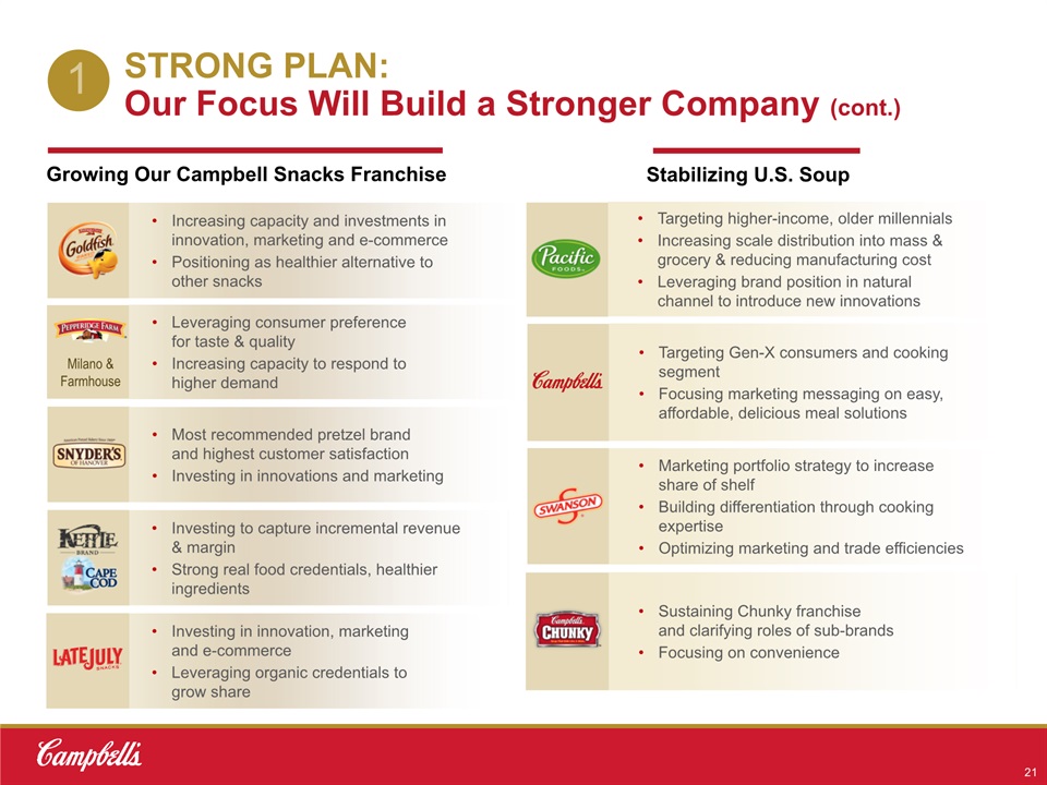 20 Sources: Public Filings.1. IRI MULO L52W through 6/24/18; IRI MULO L52W through 7/29/18; Market Position determined by Manufacturer rank.2. IRI All-Outlet for 52 Weeks Ending 7/29/18.3. Campbell's consumer perception survey conducted July 2018. Leading market share in 6 categories (#1 or #2) including Soup, Italian Sauce, Mexican Sauce, Crackers, Pretzels and Kettle Chips1More than 95% of all U.S. households have a Campbell product in their home2Ranked higher than competitors in taste across of 7 of 8 categories in which it competes3 Campbell Snacks Campbell Meals & Beverages Campbell’s New Structure Focuses on Fast Growing Snacks and High Margin Meals and Beverages STRONG PLAN: Our Focus Will Build a Stronger Company 1
