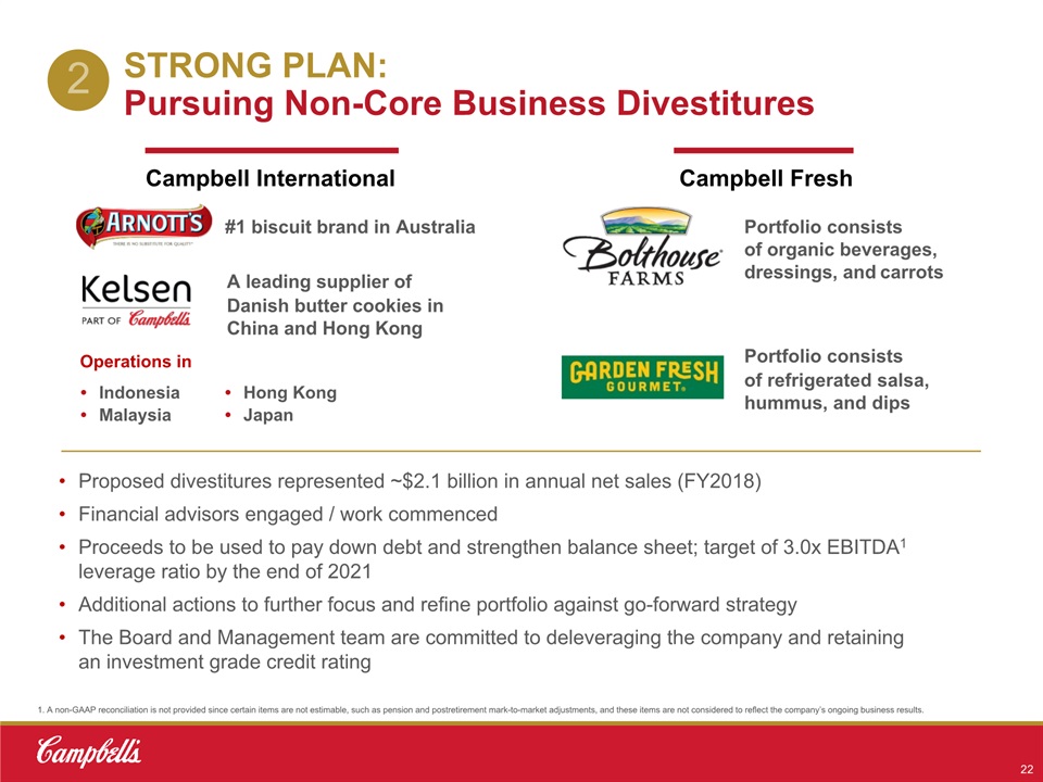 Proposed divestitures represented ~$2.1 billion in annual net sales (FY2018)Financial advisors engaged / work commencedProceeds to be used to pay down debt and strengthen balance sheet; target of 3.0x EBITDA1 leverage ratio by the end of 2021Additional actions to further focus and refine portfolio against go-forward strategyThe Board and Management team are committed to deleveraging the company and retaining an investment grade credit rating Portfolio consists of refrigerated salsa, hummus, and dips Portfolio consists of organic beverages, dressings, and carrots #1 biscuit brand in Australia A leading supplier of Danish butter cookies in China and Hong Kong IndonesiaMalaysiaHong KongJapan Operations in 22 Campbell International Campbell Fresh STRONG PLAN: Pursuing Non-Core Business Divestitures 1. A non-GAAP reconciliation is not provided since certain items are not estimable, such as pension and postretirement mark-to-market adjustments, and these items are not considered to reflect the company’s ongoing business results. 2