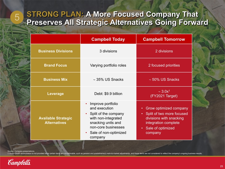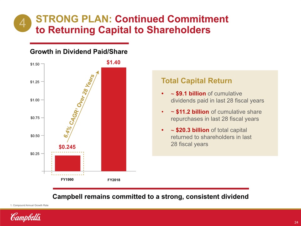 $9.1 billion of cumulative dividends paid in last 28 fiscal years~ $11.2 billion of cumulative share repurchases in last 28 fiscal years $20.3 billion of total capital returned to shareholders in last 28 fiscal years Total Capital Return 24 Growth in Dividend Paid/Share Campbell remains committed to a strong, consistent dividend 1. Compound Annual Growth Rate STRONG PLAN: Continued Commitment to Returning Capital to Shareholders 4