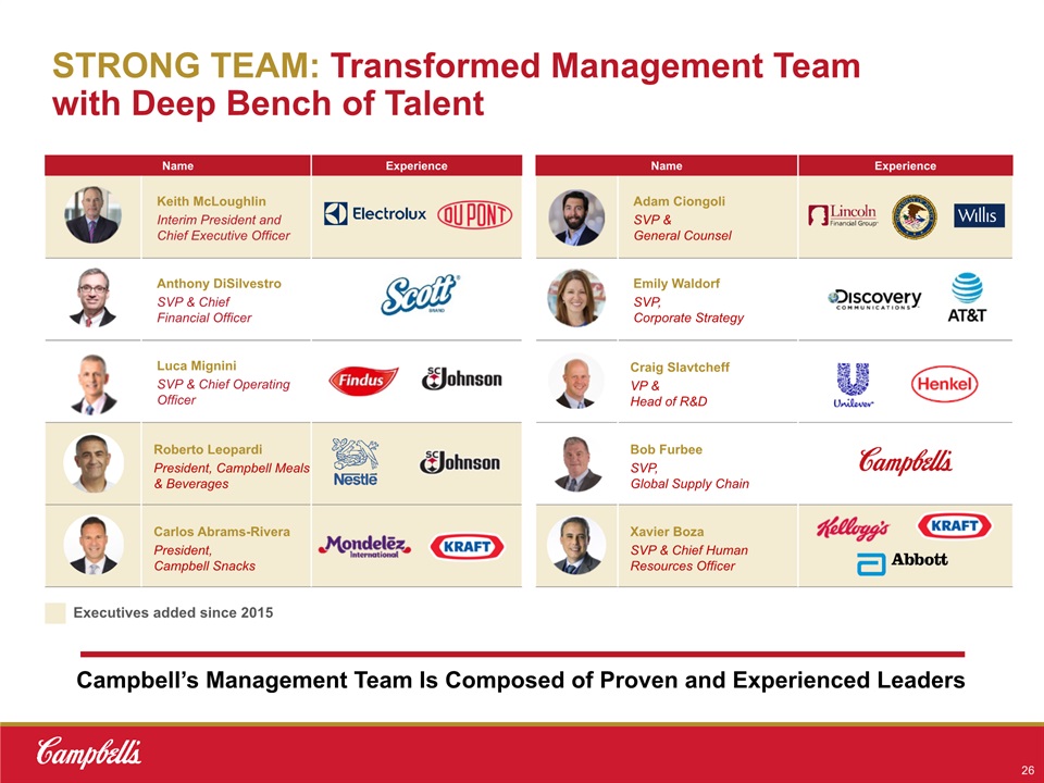 Name Experience Keith McLoughlinInterim President and Chief Executive Officer Anthony DiSilvestroSVP & Chief Financial Officer Luca MigniniSVP & Chief Operating Officer Roberto LeopardiPresident, Campbell Meals & Beverages Carlos Abrams-RiveraPresident, Campbell Snacks Name Experience Adam CiongoliSVP & General Counsel Emily WaldorfSVP, Corporate Strategy Craig SlavtcheffVP & Head of R&D Bob FurbeeSVP, Global Supply Chain Xavier BozaSVP & Chief Human Resources Officer Executives added since 2015 26 STRONG TEAM: Transformed Management Team with Deep Bench of Talent Campbell’s Management Team Is Composed of Proven and Experienced Leaders