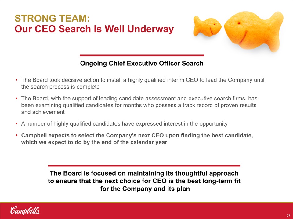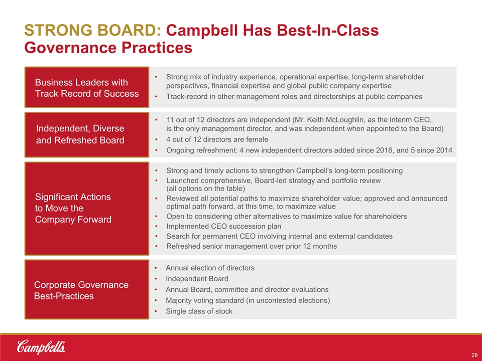 The Board took decisive action to install a highly qualified interim CEO to lead the Company until the search process is completeThe Board, with the support of leading candidate assessment and executive search firms, has been examining qualified candidates for months who possess a track record of proven results and achievementA number of highly qualified candidates have expressed interest in the opportunityCampbell expects to select the Company’s next CEO upon finding the best candidate, which we expect to do by the end of the calendar year Ongoing Chief Executive Officer Search STRONG TEAM: Our CEO Search Is Well Underway 27 The Board is focused on maintaining its thoughtful approach to ensure that the next choice for CEO is the best long-term fit for the Company and its plan