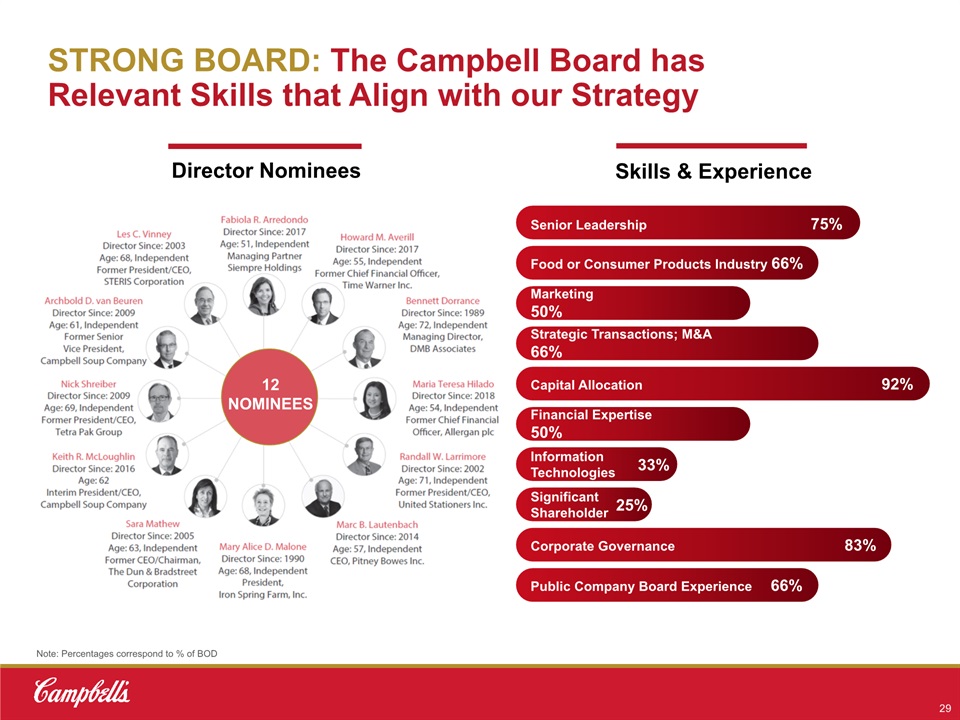 11 out of 12 directors are independent (Mr. Keith McLoughlin, as the interim CEO, is the only management director, and was independent when appointed to the Board)4 out of 12 directors are femaleOngoing refreshment: 4 new independent directors added since 2016, and 5 since 2014 Strong and timely actions to strengthen Campbell’s long-term positioningLaunched comprehensive, Board-led strategy and portfolio review (all options on the table)Reviewed all potential paths to maximize shareholder value; approved and announced optimal path forward, at this time, to maximize valueOpen to considering other alternatives to maximize value for shareholdersImplemented CEO succession planSearch for permanent CEO involving internal and external candidatesRefreshed senior management over prior 12 months Annual election of directorsIndependent BoardAnnual Board, committee and director evaluationsMajority voting standard (in uncontested elections)Single class of stock STRONG BOARD: Campbell Has Best-In-Class Governance Practices 28 Strong mix of industry experience, operational expertise, long-term shareholder perspectives, financial expertise and global public company expertiseTrack-record in other management roles and directorships at public companies Business Leaders with Track Record of Success Independent, Diverse and Refreshed Board Significant Actions to Move the Company Forward Corporate Governance Best-Practices