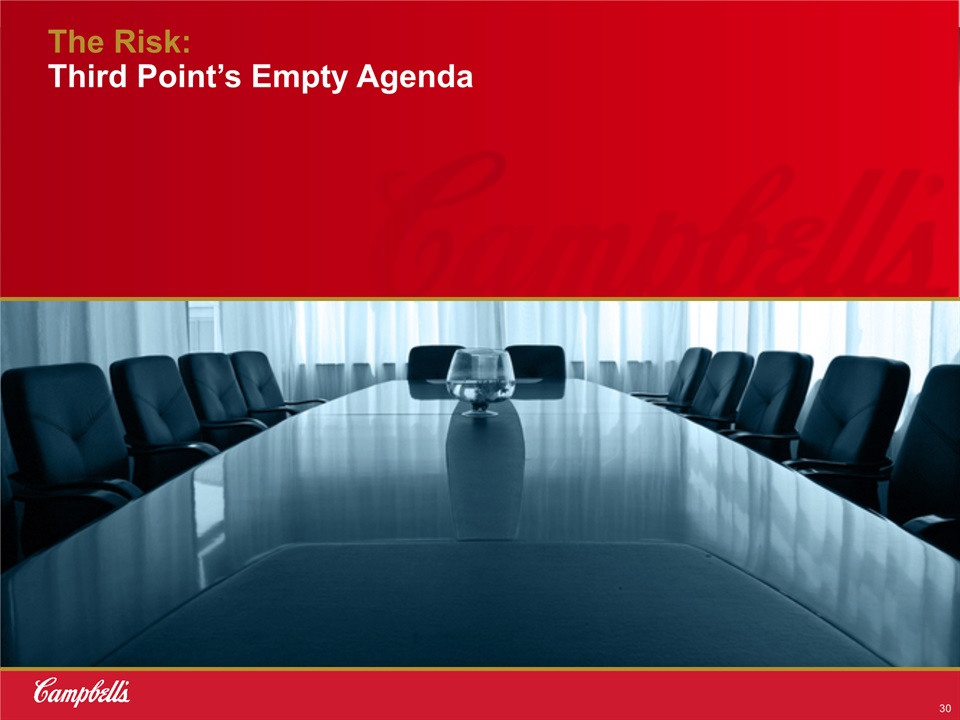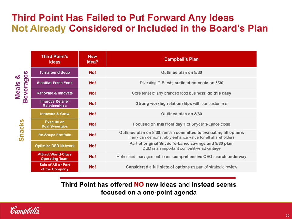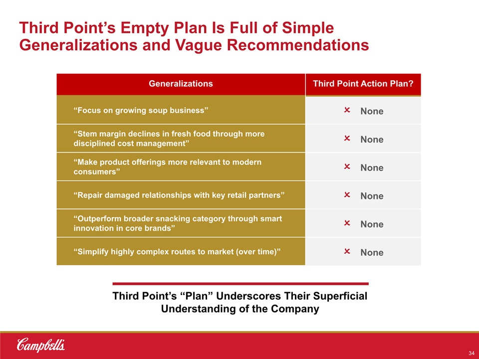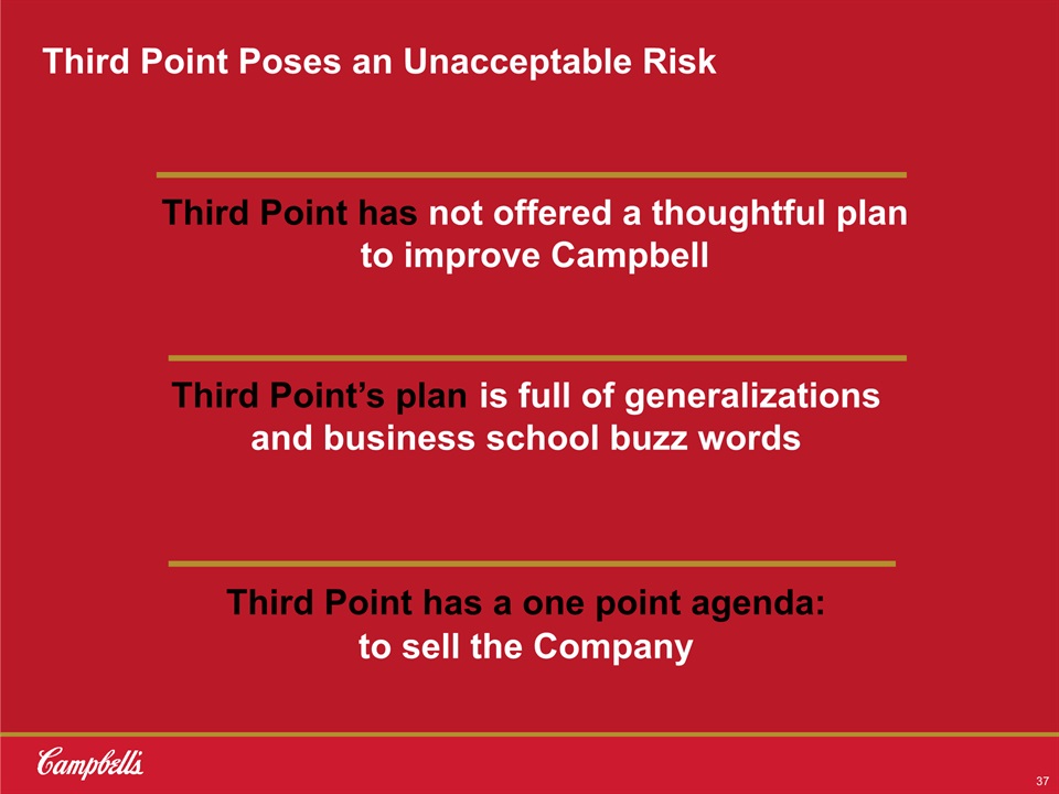 Third Point Poses an Unacceptable Risk 37 Third Point has not offered a thoughtful plan to improve Campbell Third Point’s plan is full of generalizations and business school buzz words Third Point has a one point agenda: to sell the Company