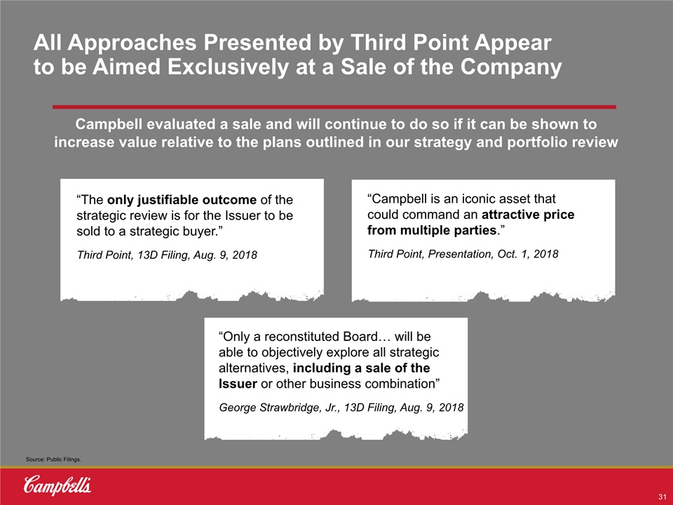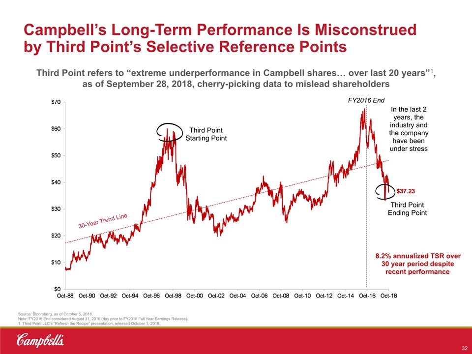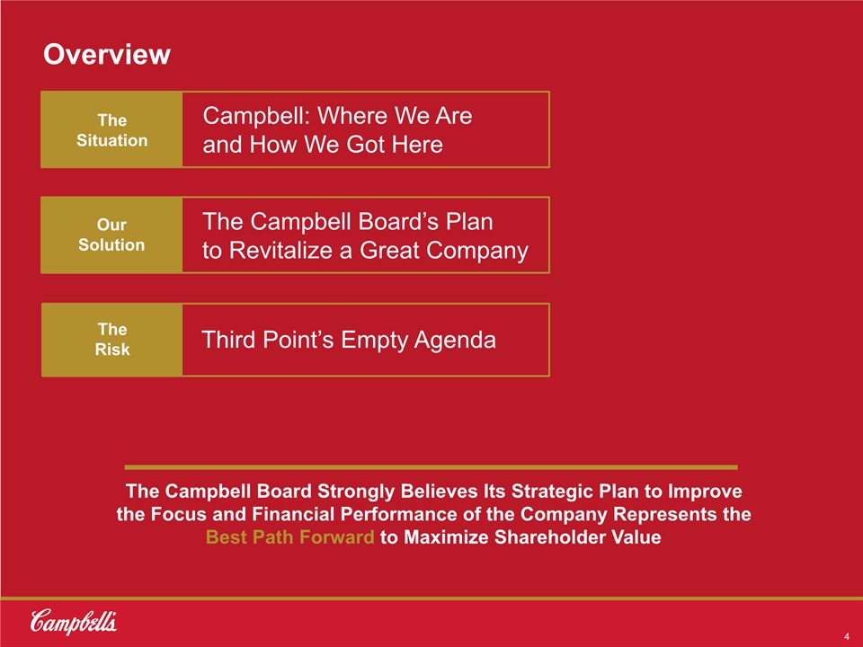 In the presentation, Campbell provides additional perspective around its performance over the last 18 months; highlights the strength of its recently announced plan to revitalize the company and maximize value; outlines why Third Point's actions and nominees are not aligned with shareholders' interest; and reiterates the Campbell Board's complete alignment and commitment to deliver value for all shareholders.