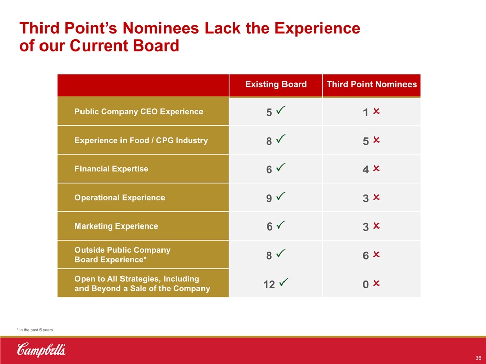 Third Point Has Failed to Put Forward Any Ideas Not Already Considered or Included in the Board’s Plan Third Point’s Ideas New Idea? Campbell’s Plan Turnaround Soup No! Outlined plan on 8/30 Stabilize Fresh Food No! Divesting C-Fresh; outlined rationale on 8/30 Renovate & Innovate No! Core tenet of any branded food business; do this daily Improve Retailer Relationships No! Strong working relationships with our customers Innovate & Grow No! Outlined plan on 8/30 Execute on Deal Synergies No! Focused on this from day 1 of Snyder’s-Lance close Re-Shape Portfolio No! Outlined plan on 8/30; remain committed to evaluating all options if any can demonstrably enhance value for all shareholders Optimize DSD Network No! Part of original Snyder’s-Lance savings and 8/30 plan; DSD is an important competitive advantage Attract World-Class Operating Team No! Refreshed management team; comprehensive CEO search underway Sale of All or Part of the Company No! Considered a full slate of options as part of strategic review Meals & Beverages Snacks Third Point has offered NO new ideas and instead seems focused on a one-point agenda 35