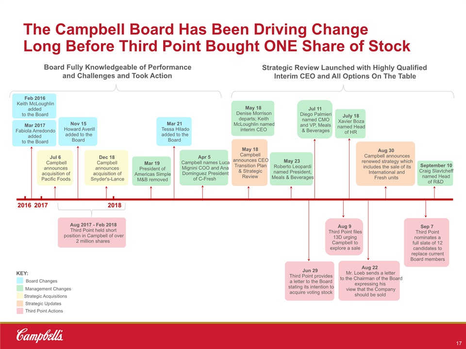 What Campbell Is Doing Right Now to Improve Performance The Campbell Board is active and engaged, having identified the need for change, and is implementing a plan to make Campbell strongerSimplify, focus & optimize portfolio to focus on core North American marketDivest non-core businesses, using the proceeds to pay down debtImprove execution, speed and efficiency, through additional cost savings programContinued commitment to our dividendCampbell strongly believes it has the right plan, to be executed by a new management team, and an active Board with the skills and experience to oversee it The Campbell Board will continue to seriously consider other strategic options if they can demonstrably enhance shareholder value beyond what we confidently believe can be achieved from executing our August 30th plan 16