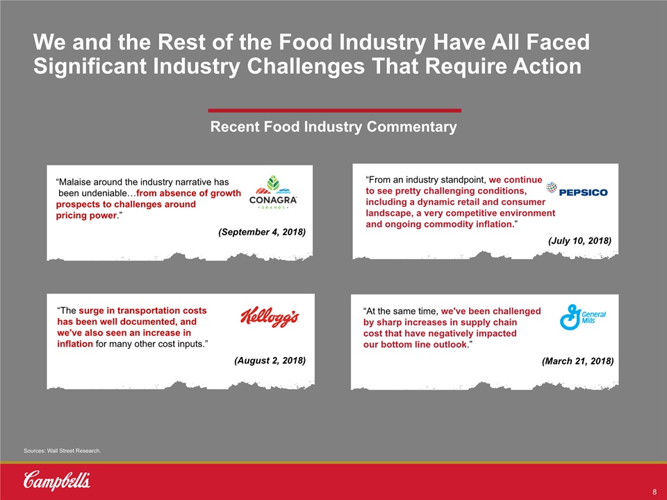 7 Sources: Wall Street Research. Universal Acknowledgment That All Food Companies Must Adapt Their Strategies and Financial Targets “The US Packaged Food industry is undergoing disruptive change: decelerating sales growth, changing food preferences… driving a new era of industry challenges.” UBS (August 30, 2018) “In a slow sales environment, global food giants need a new growth formula. Danone and Unilever are both buying higher-growth companies and using fashionable cost-cutting philosophies to improve profitability. Bigger rival Nestlé, which reported its half-year earnings on Thursday, is trying too, but less convincingly.” Reuters Breakingviews (July 27, 2017) “Consumers have had an increased inclination to have a healthier diet, and the plant-based food market is the next target for these consumers. While the industry is still very small, we expect the influx of start-up businesses entering the market to expand rapidly and gain market share at the expense of traditional branded foods companies…” Credit Suisse (September 28, 2018) “Instead of promoting canned soup, cereal and cookies from companies like Kraft Heinz, Kellogg and Mondelez International grocery stores are choosing to give better play to fresh food, prepared hot meals, and items from local upstarts more in favor with increasingly health-conscious consumers... The shift in shopper preferences started several years ago, but its impact on big food makers is intensifying now because of added pressure from retailers.” The Wall Street Journal (April 30, 2017) Representative Industry Points of View
